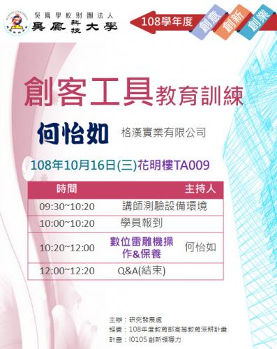 活動時間:2019年10月16日 10:00 ~ 12:30 | 活動地點:花明樓 研發處(TA009創客夢想空間) |