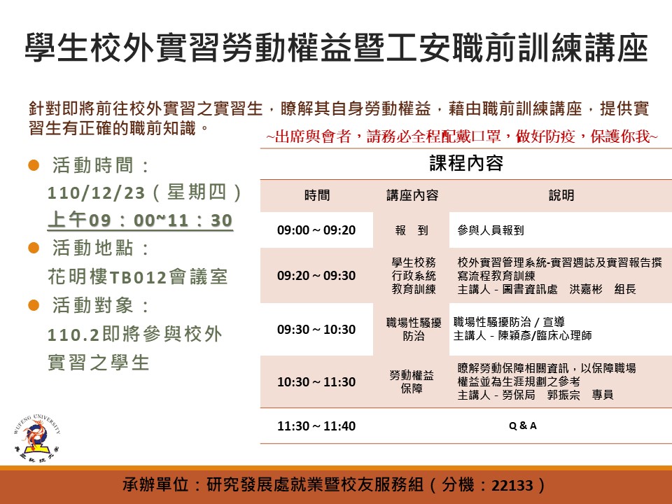 【研發處】學生校外實習勞動權益暨工安職前訓練講座 | |