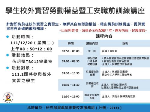 | 【研發處】學生校外實習勞動權益暨工安職前訓練講座 | |